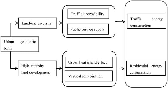Therefore, the impact of the urban compact form on household energy consumption is uncertain which depends on the superposition effect of the two effects: if the urban compact form is dominated by reducing the impact of traffic on energy consumption, the urban compact form will reduce the energy consumption of residents; if the residential energy consumption is indirectly affected by the compensation of residential area, the higher the urban compact form, the higher the household energy consumption (Figure 1).