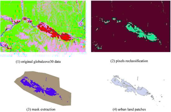 The data processing steps are as follows: First, we reclassified the urban pixels. Since China’s urban sprawl is intervened by governmental land approvals and permissions, which implies that urban areas expand within urban jurisdictions. Thus, we delineate the contour boundary of the municipal district by boundary data of county-level administrative districts and a Google Earth historical map. Third, once the urban patches (contiguous or un-contiguous clusters of pixels) are identified, thus urban form index can be calculated. Figure 2 shows the data process taking Lanzhou city in 2010 as an example.