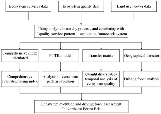 In this study, after completing the collection and pretreatment of various types of data, based on the “pattern-quality-service” evaluation framework system, the AHP was used to determine the weight coefficient of each index. Then ArcGIS was used to calculate the ecosystem comprehensive evaluation index, which was used to comprehensively evaluate the ecosystem evolution in the NFB. At the same time, the forward and reverse conversion index (PNTIL) model was used to analyze the evolution of its ecosystem pattern. The transfer matrix was used for quantitative spatio-temporal analysis of EQ, and the geographical detector model was used to analyze its driving force. The technical roadmap is shown in Figure 2.