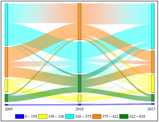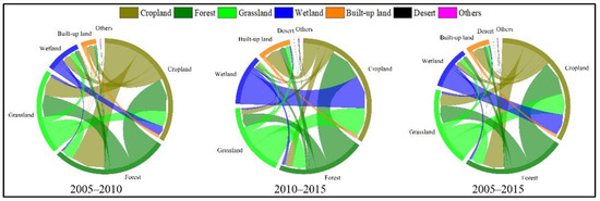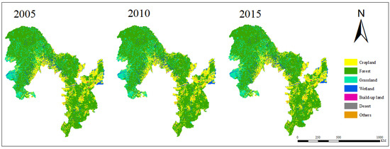 From 2005 to 2015, the classification result of ecosystem patterns in the NFB is shown in Figure 3 and Table 4. It can be seen that forest, grassland, and cropland were the main ecosystems. Statistics showed that the area of these three ecosystems was about 580,000 km2, accounting for more than 94%. Wetland, built-up land, desert, and other ecosystems were scattered in the NFB. During 2005–2015, the structure of ecosystems in the NFB was relatively stable, but conversions between different types were frequent due to climate change, human activities, and other interference factors. Ecosystem transfer in the NFB during 2005–2015 is shown in Figure 4.
