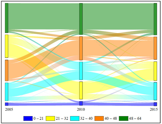 A quantitative spatio-temporal analysis of EQ in the NFB was carried out. The results of EQ were divided into five grades, and the transfer matrix of five grades of EQ in three periods was counted to reflect the changes in EQ in time and space. Using the following formula to calculate the proportion of different levels of EQ area [47]: