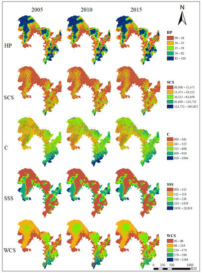 One of the important purposes of the construction of the NFB is to improve regional ES and promote regional ecological stability. The rich ES assessment in the NFB is added to the assessment framework system, which can better realize the protection, improvement, and sustainable development of the ecosystem. Therefore, this study selected SSS, SCS, WCS, C, and HP five ES for analysis and evaluation.