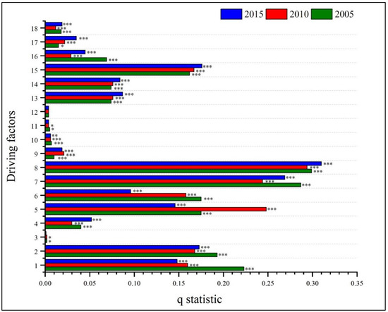 Figure 11. Geo-detector model results of the original index system in the NFB. Note: 1 is elevation, 2 is slope, 3 is slope direction, 4 is temperature, 5 is precipitation, 6 is NPP, 7 is cropland, 8 is forest, 9 is wetland, 10 is grassland, 11 is built-up land, 12 is clay, 13 is silty sand, 14 is sand, 15 is soil type, 16 is population density, 17 is GDP, and 18 is road. *** indicates that the correlation is significant at the 0.001 level; ** expresses relevance at the 0.01 level; * indicates that the correlation is significant at the 0.05 level.