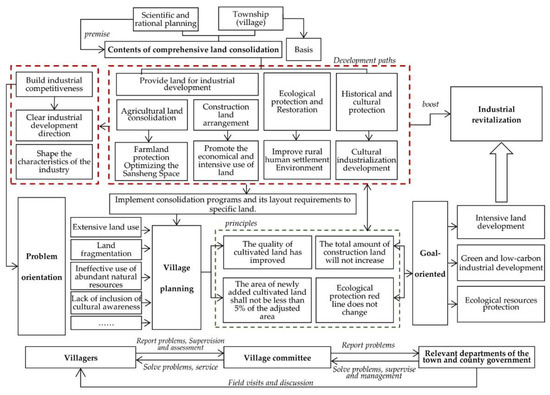 The logical relationships between comprehensive land consolidation and industrial revitalization are mainly summarized and illustrated in Figure 5, which integrates the comprehensive land consolidation into village planning and shows the development paths of industrial revitalization via land consolidation. Specifically, in the process of village development in China, some villages are currently experiencing problems such as extensive land use, land fragmentation, ineffective use of abundant natural resources, lack of inclusion of cultural awareness, low-quality cultivated land, the requirement to improve the human settlement environment, and insufficient industrial development. The solution to these problems is based on the premise that rural industrial revitalization can be achieved. The aims of comprehensive land consolidation are the improvement of the intensive use of village land, the promotion of the human settlement environment, and the optimization of the biophysical environment [52] through improving village agricultural land, arranging construction land, protecting ecological land, and protecting historical cultural sites. These approaches can provide land for industrial development and can help to increase industrial competitiveness. The principles of village planning are related to cultivated land, construction land, and ecological land (Figure 5). The goals of village planning are intensive land development, green and low-carbon industrial development (i.e., a highly efficient industrial chain using natural resources, and clean energy and recycled industrial waste), and ecological resource protection. Therefore, the aims of comprehensive land consolidation are consistent with the principles and goals of village planning, both of which build a solid basis for development paths of rural industrial revitalization. In addition, village planning also provides specific land for the implementation of land consolidation programs (e.g., rural industrial development and construction land arrangement) and its layout requirements in the future, which support the achievements of industrial revitalization via land consolidation. In addition, according to the framework illustrated in Figure 5, the contents of the red dotted box are illustrated in Figure 6, Figure 7, Figure 8 and Figure 9 to show the development paths in detail.