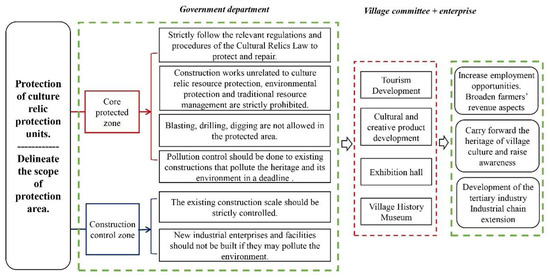 The protection of historical and cultural heritage begins with the delineation of core protection zones and construction control zones. The flow chart in Figure 9 illustrates the specific protection measures and protection significance of the government, village committees, and enterprises for cultural heritage in village planning.
