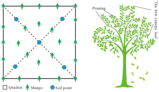 In March 2021, the sample plots were selected according to the nutritional status, blooming, and decaying of the fruit trees in the different landscape types (depressions and non-depressions) of the low-yielding and medium-yielding orchards in the Tainong mango orchards in the karst area during the flowering period. Three parallel sample plots were set up for each type, with a total of 18 sample plots 10 × 10 m in size. Three high-yielding orchards (>70 kg/plant) were selected as controls in the non-karst area, and the average plant yield of each sample plot was divided into five low-yielding orchards (<30 kg/plant) and 13 medium-yielding orchards (30–60 kg/plant) over the last two years. All the sample plots were Tainong mango varieties, and the trees were about 8 years old. The fertilization period is normally occurs after the harvest (in autumn) and before flowering (in April). According to an interview with local farmers, the orchard had not been fertilized in March 2021 when the soil samples were collected. For financial and labor reasons, foliar fertilization was not used by the local farmers during the harvest, vegetative growth, and flowering periods of mango plants. The sampling was conducted to avoid the fertilization period, and the surface soil was sampled using the five-point method (Figure 2), with the sampling points selected in the center of the adjacent mango tree line to avoid the fertilization ditch, and 0–20 cm surface soil samples were collected. Then, leaf samples were collected from the sample plots by randomly selecting normal plants with basically the same growth, and taking a piece of the first (top) leaf from the east, south, west, and north in the middle and upper parts of the tree in four directions after pruning. A total of 60–80 pieces were collected as a mixed sample, and five batches were taken from each sample plot. The collected leaves were washed and wiped clean with ultra-high pure water, killed in an oven at 90 °C for 30 min, and then dried at a constant temperature of 75 °C. Then, the soil and leaf samples were determined by referring to the classic determination method [27].