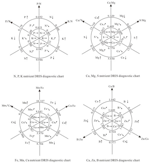 The DRIS graphical solution method is composed of three axes intersecting at a point with a pointing angle of 60° and two concentric circles passing through the intersection point. The radii of the inner and outer circles were 2/3 and 4/3 times the standard deviation of the high-yielding group, respectively. The three axes indicated the magnitude of the ratio of two to two of the three elements; the center of the circle was the best value of the nutrient ratio of the plant in the high-yielding group, and the inner circle was regarded as the nutrient equilibrium zone and was represented by “→”. Between the inner circle and the outer circle was the maximum or minimum of the nutrients expressed by “↗” and “↘”, respectively, and outside the outer circle was the excess or lack of nutrients expressed by “↑” and “↓”, respectively [29]. The DRIS graphical method can only be used to demonstrate three nutrient elements and their proportional relationships at a time.