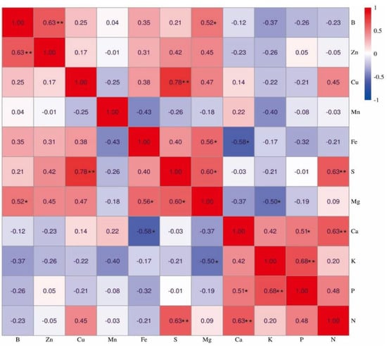 The correlation coefficients of the nutrient elements of the Tainong mango leaves. *. Significantly different at the 0.05 level, **. Significantly different at the 0.001 level.