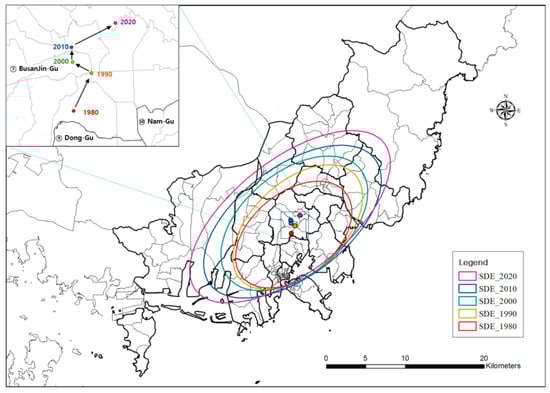 The center and form of the urbanized area, identified using Bachi’s Index, can be seen in Table 3, and the SDE appears in Figure 5. The SDD of Bachi’s Index demonstrates an increase from 6703.9 in 1980 to 10,717.5 in 2020. This indicates that the distribution of urbanization patterns expanded throughout the space. The mean center represents the centrality of the urbanized area, with the average center moving 1087.2 m northeast (64.8°) in 1990 compared with 1980, having moved 569.5 m northwest (149.28°) in 2000, 385.92 m north (94.38°) in 2010, and 1313.1 m east (29.0°) in 2020. The oblong value did not change significantly between 1980 and 2020, indicating that the form of urbanization expansion increased evenly in all directions except the south. The orientation of urbanization expansion progressed in all directions but to varying degrees. As seen in Figure 5, the SDE extended in along the east-west direction, owing to a significant expansion of urbanized areas in Gijang-gun and Gangseo-gu. Compared with 1980, urbanized areas in Gijang-gun increased by 3.986%, and those in Gangseo-gu increased by 1.468%.