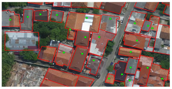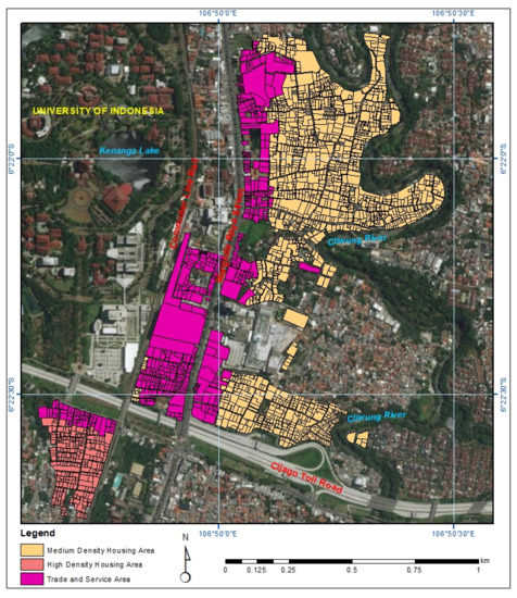 This study was conducted in Depok City, which is located at 6°18′30″–6°28′ 00″ south latitude and 106°42′30″–106°55′30″ east longitude. The city is also situated at an elevation of 50–140 m above sea level and slopes between 0–25% and is supported by two large rivers, namely the Ci Liwung and Ci Sadane. Furthermore, Depok City is one of the development centers in West Java Province, and is directly adjacent to DKI Jakarta and located within the Jabodetabek area. The complexity and integration of this area have caused the massive urbanization process and positively affected the rate of property development. The area of this city is approximately 19,998.49 ha or 199.98 km2, in which 11 sub-districts and 63 urban villages are contained. With limited LiDAR data, the buildings sampled in this study are scattered around various Jalan Margonda areas, such as Pondok Cina and Kemiri Muka Villages. As observed in the 2020–2040 Depok City RTRW Raperda concerning the City Activity Centre System, the present experimental location is included in the area planned as the PPK (Margonda City Service Centre). The distribution of the sampled buildings is shown in Figure 1.