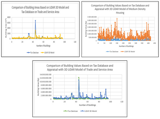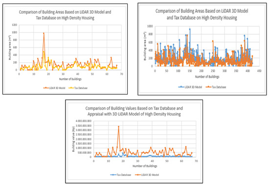 Based on Figure 7 and Figure 8, high-density housing contained 67 building plots, with 10 being vacant lands. This showed that a total of three and seven parcels were registered as NJOP land without and with buildings, respectively. The medium-density housing area also contained 420 building parcels, with 31 plots being vacant lands. In this case, 10 and 21 parcels were registered as NJOP land without and with buildings, respectively. Meanwhile, 96 building plots were observed in the trade and service areas, where a total of 11 parcels were vacant lands. From these results, 10 and 1 building plots were registered as NJOP land without and with buildings, respectively. Regarding the LIDAR 3D model, the parcels identified and registered as NJOP land with buildings were vacant lands. This showed that the building areas in the high and medium-density, as well as the trade/service housings, were 1.66-, 1.35-, and 1.08-times higher than those in the tax data at the Depok City Revenue, Financial Management, and Assets Office, respectively.