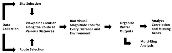 Figure 1 gives an overview of the process we used to conduct this study. This process was utilized for all terrain types, as well as both viewpoint-reduction methods. The process included the following steps: (1) data collection, (2) site and route selection, (3) the creation of viewpoint measures of 1, 10, 20, 30, 40, 50, and 100 m for each environment, (4) running the GRAVIA tool for each viewpoint distance and each environment, (5) image analysis and correlation, and (6) the creation of graphs for correlation and other analyses including the multi-ring analysis.