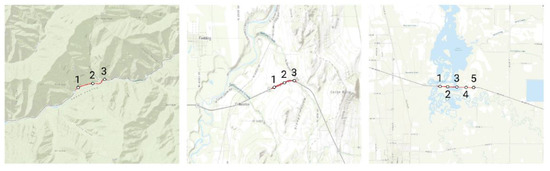 Environment highway segment for mountainous (left), hilly (middle), and flat (right) environment context maps. The labeled points correspond with street images in Figure 3 as reference.