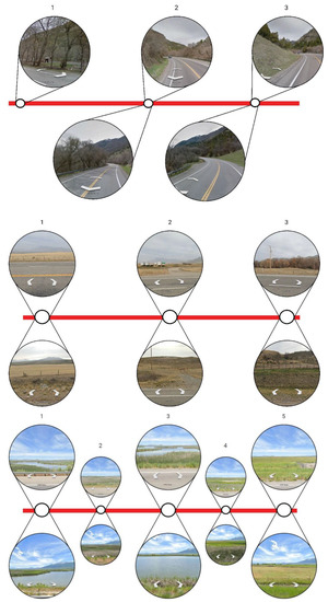 The general area selected for this study is within the authors’ home region, which made it easy to identify areas with high distinction without relying solely on publicly available geospatial data. The selection of three test sites was guided by our intimate knowledge of the area, which consists of two large mountain ranges, a well-defined topographic valley, and clearly delineated highways that intersect the valley and extend into clear passes through the mountains. To minimize the potential erroneous impacts from representing urban development, sites were selected from places identified as clearly fitting one of the three topographic conditions (mountainous, hilly, and flat) with minimal infrastructure development along a major highway. The first site selected, Logan Canyon, is within the Cache National Forest just east of Logan, UT, and is a very mountainous area. The second selected site is located on Utah Highway SR30, just northeast of Collinston, UT. This area contains some rural development and a significant amount of agricultural development with flat to undulating terrain. The surrounding terrain is filled with undulating hills and a river section that cuts through the hills to the north of our selected route. This area is mostly farmland but with the presence of the river, the area also attracts recreationists. This additional area provided us with a topographical middle ground between the mountainous and flat sites. The third site is along the Utah Highway SR30 just outside of Benson, UT where there is a large wetland on either side of the roadway, which provided sufficient terrain for our flat environment site. All the selected routes are located near popular local and regional recreational areas. A one-mile-long route was selected from each site to compare and contrast the differences in the effects of topographical properties on visual magnitude. Each site with its mile segment can be found in Figure 2 with corresponding images of each point in Figure 3.