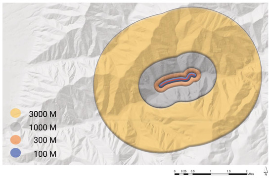In addition to our preliminary analysis of our three environments, we wanted to evaluate the extent to which the distance was influenced. To accomplish this, we decided to develop a zonal distance analysis for our selected routes at distances of 100, 300, 1000, and 3000 m. Zonal distances were used to analyze data at distinct distances from the immediate vicinity (0–100 m), the middle ground (100–300 m), the visually distant area (300–1000 m), and the visual edge (1000–3000 m), though these distances were arbitrarily derived. Figure 4. illustrates the zones for the Mountainous environment, with the one-mile segment buffered by each of the zonal distances.