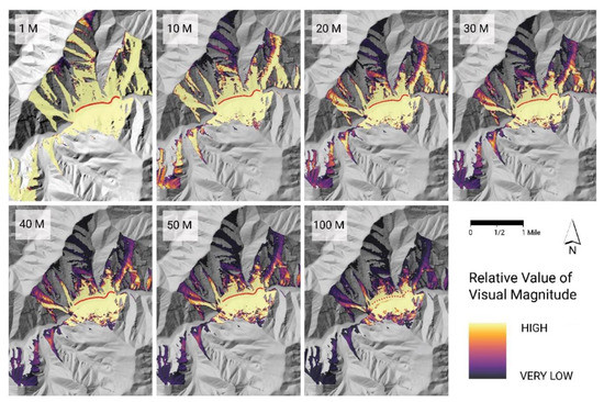 GRAVIA produces an objective normalized value from 0 to 1 for each cell of the raster output, making the comparisons somewhat straightforward. For this study, the efforts were focused on determining a Pearson correlation coefficient to identify how each of the different intervals and sampling techniques compared to one another. However, before this analysis could be produced, the data needed to be adjusted because of the differences in the total visible area (some intervals resulted in a greater visible area than others). To accomplish this, we built an analysis mask that combined all the visual-magnitude outputs into one raster where there were no null values in one or more outputs (a null value indicates that an area is not visible and cannot be analyzed by a coefficient). The mask was used to extract the visual-magnitude values for each visible cell across all analyses, ensuring that the same cell was being compared across outputs. To conduct the Pearson correlation, each raster cell value was extracted into a one-dimensional dataset and analyzed using R Statistical Software, specifically the raster package [32]. Using ArcPro, we noted the total missing values (not part of the mask) for the analyses that were not part of the base 1 m interval. These were included as the error of the difference between the total visible area compared with the visible area from the 1 m result and all the other images. The combination of the Pearson correlation and the error provides an effective snapshot of each different sampling technique.