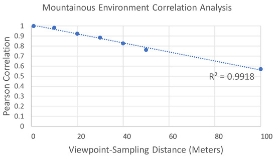 To interpret our calculations, we conducted a Pearson correlation r and followed recommendations from various fields that provide insight into the meaning of the results. The results provide a correlation of the average visual-magnitude [20] values across all the viewpoints, essentially comparing the topographical response to the viewpoint-sampling distances. So, while these data sit squarely within the physical sciences, the interpretation of these data falls within the realm of psychological sciences because we are most interested in how individuals perceive topography. To this end, we recognize that there are different interpretations between the physical and social sciences regarding Pearson’s r. In social sciences, the interpretation of Pearson’s r is somewhat well-defined, with 0.9 said to be very high (e.g., [36]), 0.7 is strong or high positive (e.g., [37]). However, when considering these data in terms of test–retest reliability [38], the interpretation of correlation changes, with 0.5–0.75 as moderate reliability, 0.75–0.9 as good reliability, and 0.9 or greater as excellent reliability. However, a test–retest reliability study should be conducted with comparable sampling frequencies across different times or individual samples. In our application, values were averaged across samples, which is not a conventional test of reliability.
