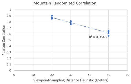 Figure 7 shows the results from the random viewpoint-reduction method resulting in a variation of correlation values between 5 to 10% for each viewpoint-sampling-distance interval. Each dot on the graph corresponds to one of the random viewpoint-selection sets. Overall, the randomized viewpoint routes returned correlation values lower than their corresponding interval measures. The correlation between our randomized measures has an R2 = 0.9546, which remains high, but the slope is nearly double that of the equal interval technique at a roughly 0.065% loss of correlation per meter increase in the viewpoint-sampling distance.