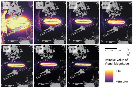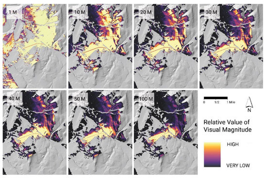 Figure 5 showcases the total visual magnitude for each of the equal interval analyses. The one-mile route is presented, but the scale of the image is too small for the sampling interval to be noticed, except for the 100 m condition. The same legend was used to produce the output, resulting in an expected shift from the extent to which high values and low values are represented with each interval. This is expected because with the greater number of viewpoints, the higher the visual-magnitude values for each cell will become (increasing the number of times it is seen from each sampling point) relative to the lower sampling interval using the same legend.
