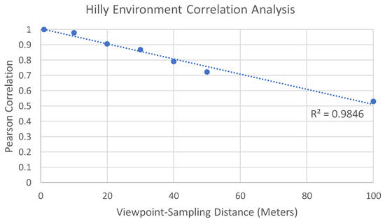 The visualization of the data appears to show a difference in the results according to the legend, with higher impacts being represented by the smaller viewpoint-sampling distance. However, the key question for this paper focused on the relative differences as measured through the correlation coefficient, as the legends are merely an illustration. Figure 6 shows the correlation between our interval viewpoints as we moved through our interval-distance-reduction process. As indicated, there is a gradual reduction in the correlation between our 10 m measure and all the other resulting measures. The R2 value, which is being used to analyze the strength of our models, is at 0.9918, indicating a very strong linear relationship as we reduce the number of viewpoints. The overall trend is negative and linear, providing a strong indication of predictability for how a reduction in sampling will impact the result. The slope is y = −0.0046x + 1.0292, or roughly for every 1 m increase in viewpoint-sampling distance, a correlation reduction of just over 0.31%.