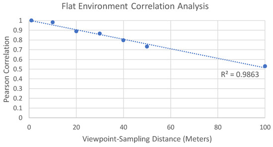 Results from the equal interval flat environment demonstrate a similar overall negative trend as we reduce our viewpoints from our 1 m measure to 100 m. Figure 10 showcases the relative change in the visual-magnitude value for the study area. Here there is a similar visual effect as in Figure 5. In Figure 11, the correlation values remain high for most of the loss in viewpoint-sampling distance, with roughly a 0.41% reduction in correlation for each meter increase. The R2 value is 0.9838, also suggesting a high degree of predicted correlation loss over distance.