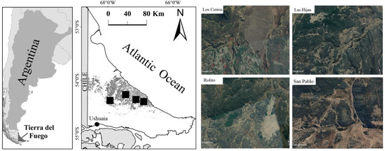 Location of study area (in black squares, from west to east: Los Cerros, Las Hijas, Rolito, and San Pablo ranches) and Nothofagus antarctica forests (grey) in Tierra del Fuego, Argentina. In the right panel, satellite images of the study area at each ranch.