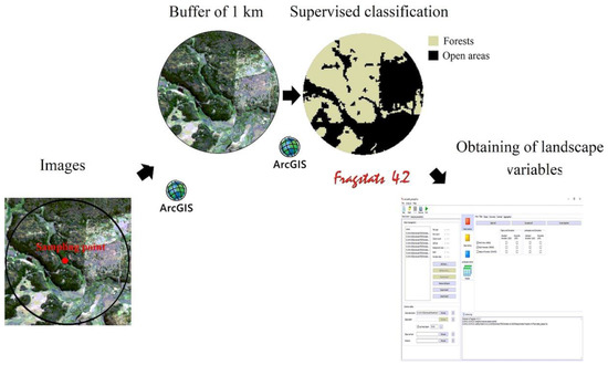 Landscape variables were obtained using Sentinel-2 images (5 December 2016 for Los Cerros and 13 February 2017 for the other three ranches) with pixels of 10 × 10 m. For each sampling point, an individually buffer of 1-km radius was created using ArcGIS software (ESRI 2011), maintaining that point in the center, and generating a supervised classification to separate forests (N. antarctica and N. pumilio) and open areas (grassland and peatlands) (Figure 2). The landscape composition and configuration within buffers were quantified using Fragstats 4 software [42], obtaining values for three types of variables (Table 1): (1) for forest patches where the count points were found (area, perimeter, and shape), (2) for forest and open area classes (total area, number of patches, largest patch index, and connectivity), and (3) for the entire landscape (total edge and edge density). Details for units and calculations are shown in Table 1. Landscape composition variables were the total forest area and the total open areas. The landscape configuration variables were the area, perimeter, and shape of the forest patches; the number of patches; the largest patch index; and the connectivity calculated for each cover type, the total edge length, and the edge density in the landscape.