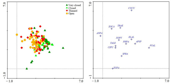 DCA ordination of Nothofagus antarctica forests (very closed, closed, thinned, and open) based on bird density data in Tierra del Fuego, Argentina, showing revisit in plots to the left and species to the right. Species acronyms are shown in Table 2.