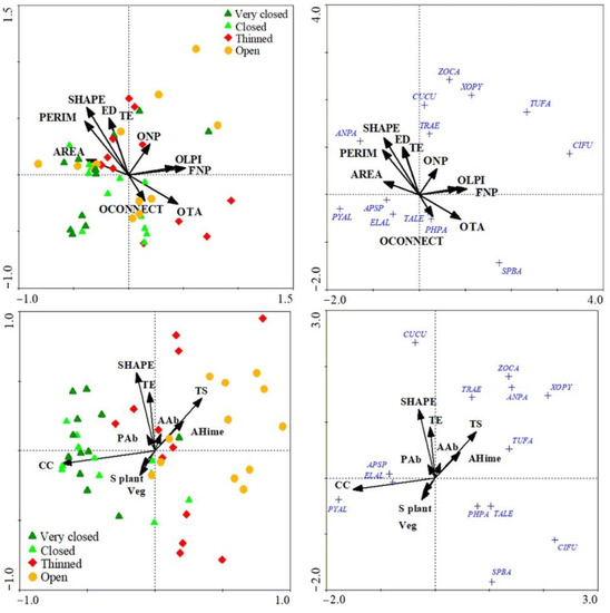 Canonical correspondence analysis (CCA) using landscape variables (superior panels) and a combination of landscape variables and stand characteristics (inferior panels) for the four analyzed Nothofagus antarctica forests (Very Closed, Closed, Thinned, and Open) in Tierra del Fuego, Argentina, showing plots and explanatory variables to the left, and species and explanatory variables to the right. Landscape variables: AREA = area of forest patch; PERIM = perimeter of forest patch; SHAPE = shape of forest patch; FNP = number of forest patches; OTA = surface of open areas; ONP = number of open area patches; OLPI = largest patch index of open areas; OCONNECT = connectivity of open areas; TE = total edge; DE = edge density. Stand characteristics: CC = canopy cover; TS = cover of tree sapling; S plant = richness of plants consumed by birds; Veg = cover of plant consumed by birds; AAb = abundance of arthropods captured by attraction traps; AHyme = proportion of Hymenoptera captured by attraction traps; PAb = abundance of arthropods captured by pitfalls. Species acronyms are shown in Table 2. Vectors of explanatory variables were rescaled for better representation.