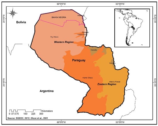 Paraguay is located in the heart of South America, neighboring Argentina, Bolivia, and Brazil (Figure 1). Its population in 2012 was estimated at 6.4 million in an area of 406,752 km2 [48]. The Paraguay river divides the country into two regions, the Eastern region which has a humid subtropical/tropical climate, and the Western region which has a drier climate with less rainfall [40]. Paraguay is very rich in biodiversity and comprises six ecoregions which include the Pantanal, Dry Chaco, Medanos (part of Dry Chaco), Humid Chaco, Atlantic Forest, and Cerrado [49,50].
