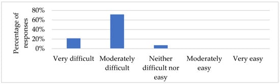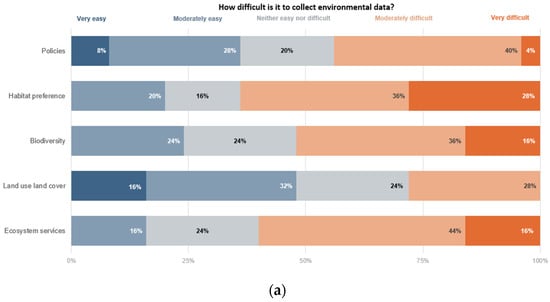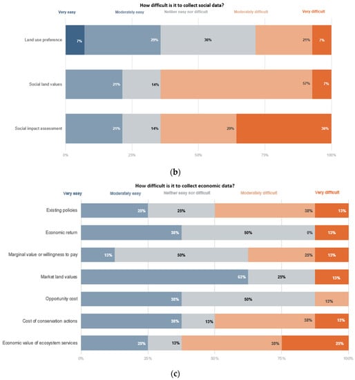 Experts identified lack of data as the most important barrier to develop land-use plans in Paraguay. Therefore, we used the survey instrument to identify how difficult it was to collect environmental, social, and economic data in Paraguay to fill these gaps. We had five specific data needs for the environmental dimension, including ecosystem services, land-use/cover, biodiversity, habitat preference for species, and existing environmental policies. Based on the results, habitat preference were the most difficult data to collect; 28% of the respondents indicated this response, and the easiest was land-use/cover with 16% of respondents identifying this as easy (Figure 3a). Some respondents expanded the list provided in the survey and identified more data needed, including protected area boundaries, agroecological zones, biological corridors, and studies on fauna and flora.