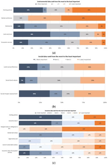 Experts ranked existing economic policies as the most important data needed to develop an integrated land-use plan (50%). Existing policies include those related to the economic development of a specific region. Moreover, they identified market land value as the second most important with 50% (Figure 4c). Only existing economic policies, economic return, and economic value of ecosystem services were listed as most important. Opportunity costs, market land values, and economic value of ecosystem services were never listed as least important (selected as number 7).