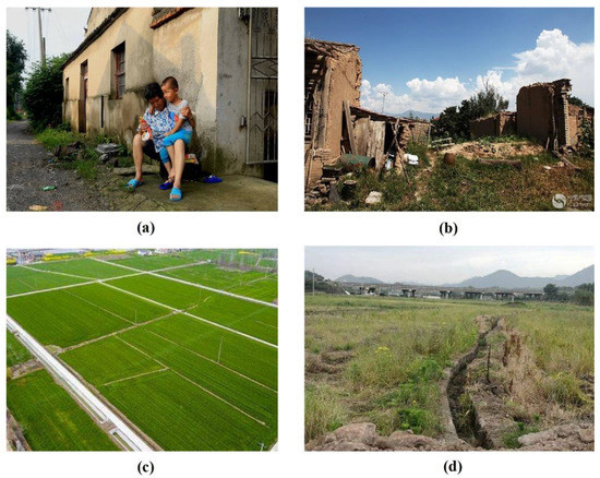 Problems caused by the loss of rural population: (a) Left-behind elderly and children. (b) Abandoned homesteads. (c) Small patch arable land. (d) Abandoned arable land.
