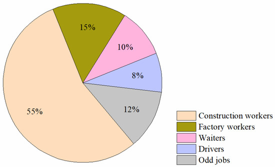 Most of the migrant workers were engaged in non-contract manual work, of which 55% were construction workers, 15% were factory workers, 10% were restaurant or hotel waiters, 8% were self-employed drivers, and the rest were mostly odd jobs (Figure 3).