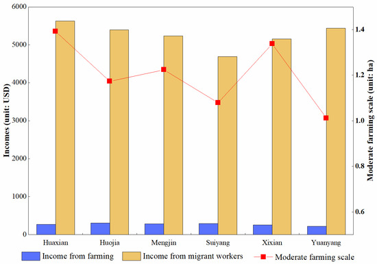 Opportunity cost theory indicates that when the income from farming is equal to income from migrant workers, the area of arable land that should be cultivated is a moderate farming scale. On the basis of the above data on the average annual income of farming and migrant workers, the correction factor of Formula (1) was 1, and the moderate farming scales of Huaxian, Huojia, Mengjin, Suiyang, Xixian and Yuanyang were calculated at 1.39, 1.17, 1.22, 1.08, 1.34, and 1.01 ha, respectively (Figure 4).