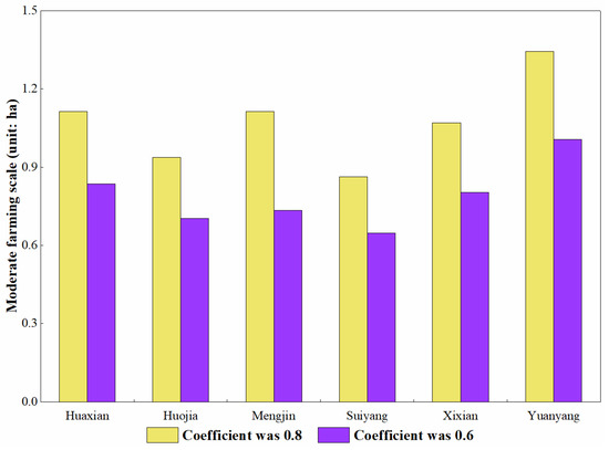 When the correction coefficient was 0.8, moderate farming scales per capita in the six counties were 1.11, 0.94, 1.11, 0.86, 1.07, and 1.34 ha, respectively. When the correction coefficient was 0.6, moderate farming scales of households in the six counties were 0.84, 0.70, 0.73, 0.65, 0.80 and 1.01 ha, respectively (Figure 5).