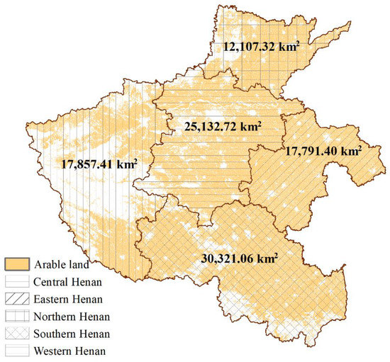 Arable land in Henan Province was derived from the land use data interpreted from Landsat TM/ETM+ images in 2020. According to statistics, arable land area of Henan Province in 2020 is 103,209.97 km2, mainly distributed in the central, eastern and northern areas of the province (Figure 6). In particular, arable land areas of central, eastern, northern, southern, and western Henan were 25,132.72, 17,791.40, 12,107.32, 30,321.06, and 17,857.41 km2, respectively.