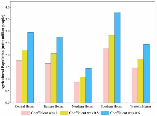 - When the coefficient of Formula (2) was 0.8, agricultural populations supported by central, eastern, northern, southern, and western Henan were 2.2174, 2.0664, 1.0881, 2.8379, and 1.8381 million people, respectively. Total agricultural population of Henan Province was 10.0479 million people;