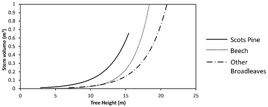 Three dendro-metric functions provided by [43] relating tree stem volume to tree height.