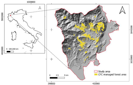 Study area in Italy (left). Area of Interest (AOI) where the forest plan had to be defined by CFC. In grey the hill shading of the SRTM 1 Arc-Second 30 m [80] (coordinate reference system is WGS 84/UTM zone 32 N).