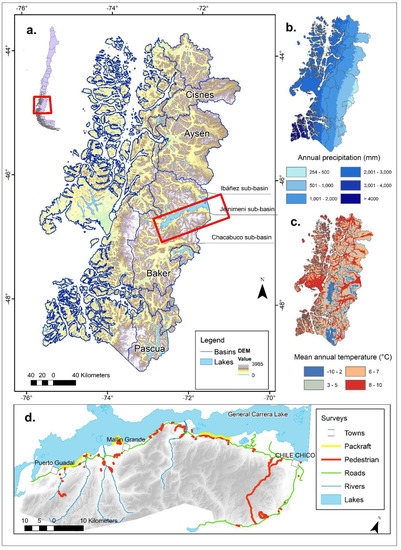 Map of the study area: (a) Central West Patagonia with information on its main basins, the small red box indicates region (a), and the red rectangle indicates study area (d); (b) raster representation of annual precipitation; (c) raster representation of mean annual temperature; (d) study area with the distribution of archaeological surveys.