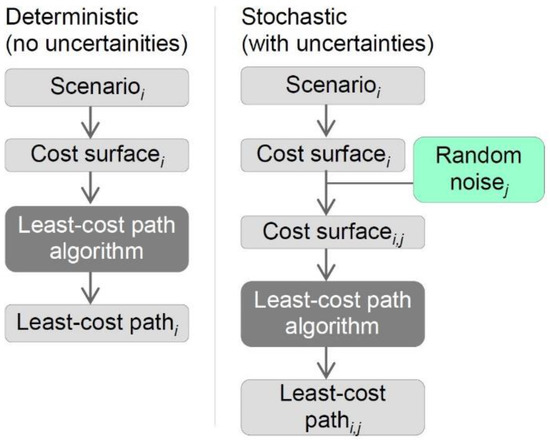 - Stochastic (with uncertainties or variability). The LCPs were obtained for Scenario 2 and Scenario 3 (i ∈ (1, 2) in Figure 2). For each scenario, we performed one hundred simulations (j ∈ (1, 2, …, 100) in Figure 2), where for each simulation, a different j random noise was added to the i cost surface. Then, the output or mobility corridor corresponds to an ensemble of a hundred likely routes.
