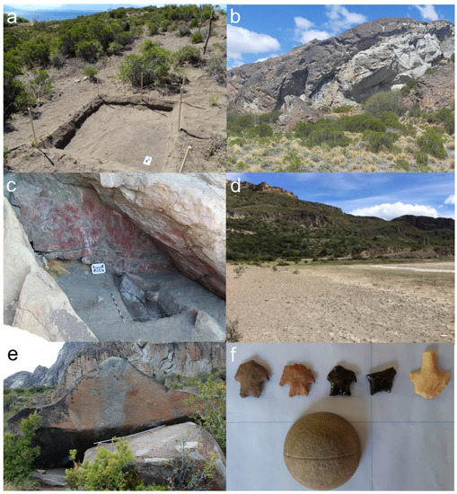 Site variability and the archaeological record along the southern coast of General Carrera Lake: (a) Chile Chico 1 site (RJ80); (b) Pampa La Perra (RJ97) site; (c) excavations at La Tina (RJ82) rock shelter; (d) Laguna El Peligro (RJ81) site on the border of the dry lake; (e) Guanaca y Luna site (RJ146); (f) characteristic lithic material from surface scatters, including fractured projectile points (silex and obsidian), a borer, and a stone hunting bola.