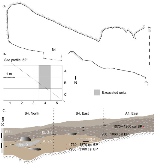 Archaeological features of the La Tina site; (a) cross section of the rock shelter; (b) excavated plan and location of the cross section of A; (c) stratigraphic section and radiocarbon chronology; feat: feature, SU: stratigraphic unit.