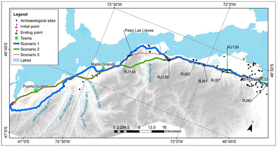 The three scenarios described above in Section 2.3.1 showed a similar path at the beginning of the route (east), close to Chile Chico town, but with important differences after 72°10′ W. First, Scenario 1 (blue line in Figure 5), which incorporates only a cost surface derived from the slope, prefers spaces close to the lakeshore and avoids crossing major rivers, especially those with deep gorges (i.e., Avilés, Los Maitenes, and Las Dunas Rivers). Specifically, in the “Paso las Llaves”, a major steepened sector located west of the Avilés River, the Scenario 1 route chose a very similar path to the current vehicular road that crosses this area. Second, the incorporation of land cover on the cost surface changed the route in many specific locations, preferring those land covers that are easier to transverse and avoiding sectors with rocks and dense vegetation. For example, the LCP for Scenario 2 (green line in Figure 5) chose to follow the Avilés River upward, thereby avoiding the steep and rocky “Paso Las Llaves”. Similarly, to the west of Mallín Grande village, the route changed its trajectory with regard to the previous scenario by using land with less vegetation cover. Finally, the restriction of traversing through highlands during winter due to snow cover in Scenario 3 introduces a new detour that avoids going up the Avilés River and the lakeshore path by using a middle option in between both previous scenarios (red line in Figure 5).