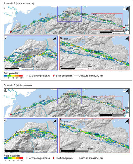 - Scenario 2 (summer) represents the summer season, and the cost surface is defined by a combination of slope (70%) and land use (30%).