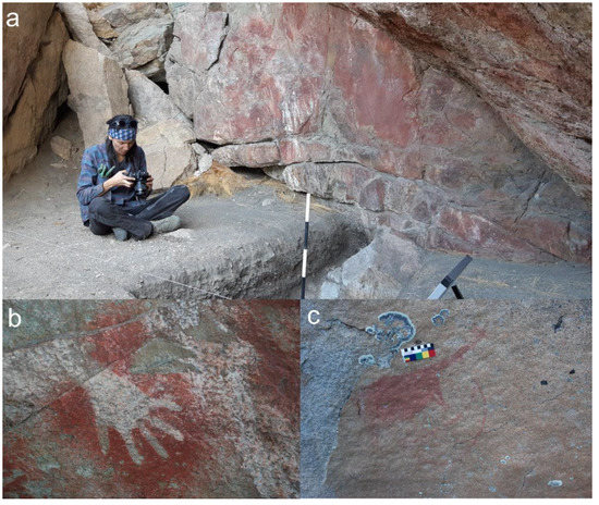 Rock art from the southern coast of General Carrera Lake: (a) excavations beside panel with painted hands at La Tina rock shelter; (b) stencil hands at La Tina rock shelter; (c) Lama guanicoe motif at Guanaca y Luna site at “Paso Las Llaves” sector.