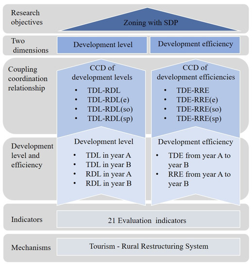 The innovation of this paper can be reflected in the methodology, which has generated an SDP assessment framework combining the two coupling coordination degrees of current development levels and development efficiencies. In comparison, the existing research mainly focuses on the impact of tourism on the rural [7,9,21] and rarely takes into account the coupling relationship, especially the relationship between development efficiencies. In addition, the interactive relationships between tourism and rural economy, society, and space have been described in this paper, which provides a detailed path with which to find the weakness. Overall, the methodology of this study could accurately and systematically describe the relationship between tourism and rural restructuring. Last but not least, this assessment framework can be referenced by other regions.