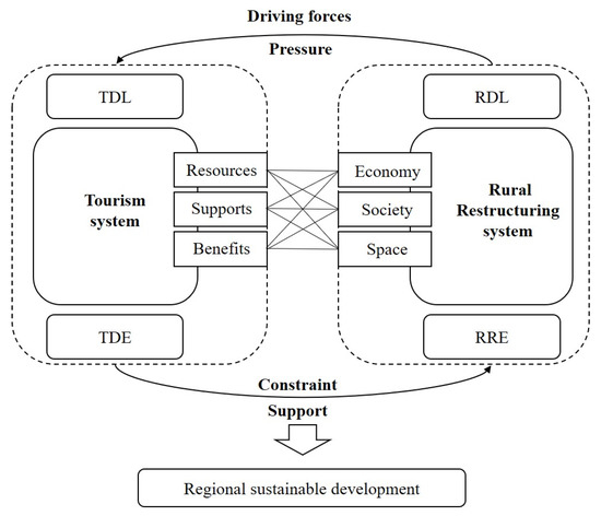 Tourism development efficiency is the comprehensive development rate of tourism resources, tourism supports, and tourism benefits. Rural restructuring efficiency is the transformation rate of rural economic–social–spatial structure. Both the efficiencies of tourism development and rural restructuring are affected by the development level in the early stage and the driving forces in the process [58].