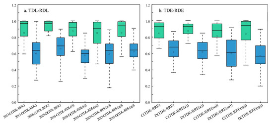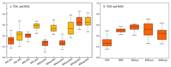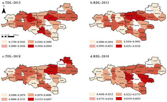 As shown in Figure 4a, from 2013 to 2018, the median of TDL in southern Shaanxi increased from 0.3255 to 0.4288, while the median of RDL increased from 0.4131 to 0.5873, indicating that both the development of tourism and rural in the whole region have significantly improved; however, RDL progressed much more than TDL. Moreover, the range of the box has a minor growth both in TDL and RDL, revealing that the gap among counties has widened. Comparing the TDL and RDL in 2013 and 2018, respectively, the medians of TDL were both lower than RDL, showing that the development of tourism lagged behind that of rural during this period. Through the results of RDL(e), RDL(so), RDL(sp), it could be found that the economy and society have dramatically improved, which was mainly a result of the policies of New Urbanization, New Rural Construction, Beautiful Countryside, Ecological Migration, and Rural Revitalization.